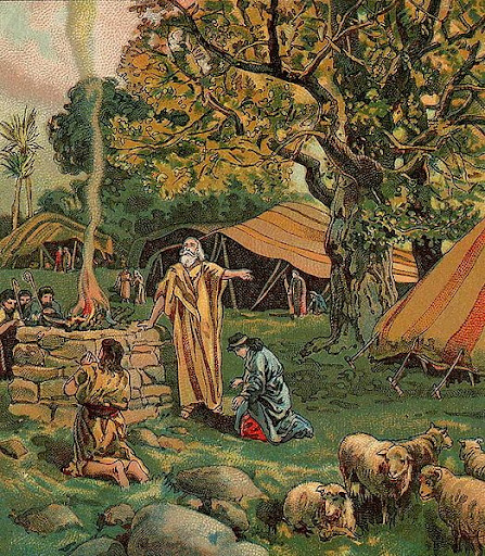 פתאום לפני אני רואה אוהל גדול והרבה אנשים נכנסים ויוצאים, אני אומר לעצמי מקום טוב לאכול, לא ירגישו שאני לא שייך לאורחים, על האוהל כתוב כאן גרים בכיף, ההורים של כל עם ישראל, אברהם הגבר ושרה הנחשקת, האמא החורגת של ישמעאל... אני סועד את נפשי, אף אחד לא שם לב אבל האוכל מרגיש לי קצת טפל, לידי יושב איש שנראה חביב, אני פונה אליו ואותו שואל: תגיד אולי יש לך קצת מלח ? אני חייב קצת בשביל המרק ירקות, הוא ממליח לי מבקבוק עליו כתוב "אישתי", ואומר לי: נעים מאוד, שמי לוט..." סיימתי את הארוחה כמקובל, תקעתי גרפס מכובד בקולי קולות, וייצאתי לחפש לי מורה דרך שיראה לי איך חוצים את החולות, בחוץ אני פוגש בחור מבוגר, כנראה מדריך טיולים, מראהו פראי, תוך כדי הליכה משותפת אני מבין שקוראים לו משה הגזעי... הוא מביא אותי עד להר נבו, ומצביע לי על ארץ ישראל הנכספת, אתה לא נכנס ? אני שואל אותו... ואווירה מסתורית את שנינו אופפת, אני כבר לא צעיר כפי שאתה רואה, אני בן מאה ועשרים עונה משה הלב שלי כבר לא מסוגל, וגם "המה שמו" שלי כבר לא מתקשה...
