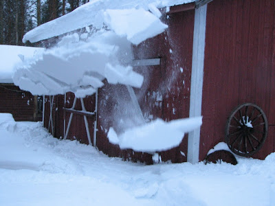 המעבר משמאל הוא ההרחבה למוסך חיזוקים לקורה מרכזית טרקטור שהושבת לחורף מפני ש"סירב" לפעול על סולר קייץ (אחרי זה התרוקן המצבר בנסיונות הפעלה) שבילים בשלג - גישה למחסנים מראה כללי של אזור המגורים (בית, סאונה, עצים מקיפים את החצר בחזית)  ללא מילים שלג מתחיל לגלוש מגג המחסן ברווווד - avalanche |