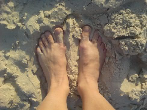 הרמתי את הכפפה וזו תשובתי: בצילום הראשון הרגליים של אישה (אין שערות) והיא צולמה כנראה בשעת צהריים בחוף בצפון הארץ. בצילום השני כפות הרגליים הן של הבן או הבת של האישה מהצילום הראשון והיא צולמה באחר הצהריים המאוחרות בחוף אחר במרכז הארץ שבו נוסעים גם רכבי שטח וזה לפי סימני הצמיגים. אם טעיתי, תורידי לי נקודות :)