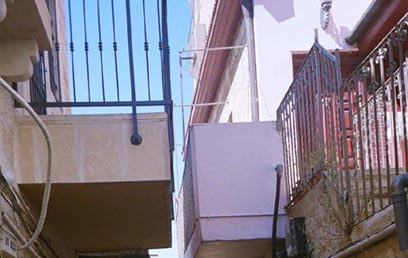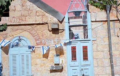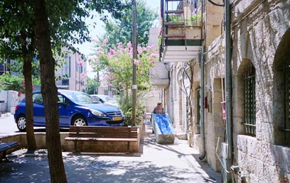 ממשיכים בה הלאה, עוברים מול ביתו העניו של "ר' אריה" כפי שכונה בפי כל, וחוצים את רחוב שומרון לכיוון שכונת מזכרת משה. ממשיכים עד בית מספר 21 שם פונים ימינה, ברחוב עיניים למשפט (המשך סמטת רבי אריה אינו נגיש), ועוצרים מול שעריו המעוטרים המרשימים של בית הכנסת של יוצאי מרוקו חסד ורחמים. כאן אפשר להגניב לתוכו מבט הנאה. פונים שמאלה, חוצים את רחוב מזכרת משה ונכנסים לשכונת אוהל משה הקרויה אף היא על-שם הנדבן הידוע סר משה מונטיפיורי. סמטה צרה. למזלו של המטייל המתגלגל, המרפסות גבוהות (צילום: יאן לוי)