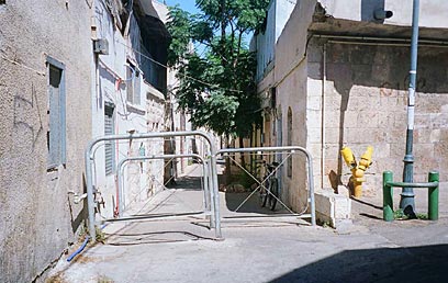 אך למרות התנאים מסבירי הפנים, עדיין איני יכולה להתאפק מלשאול שאלת תם: מדוע בתי הכנסת הרבים הפזורים בשכונה אינם נגישים לכיסא גלגלים, ואינם דואגים לרמפה שתאפשר לקהל הנכים להיכנס אליהם בקלות? הדת היהודית, מסתבר, אינה שונה מבחינה זו מהנוצרית, כפי שתואר ברשימתי הקודמת. ועוד הערה אחרונה, לפני שמתחילים: אין שירותים נגישים לנכים בשכונה ויש לקחת נתון זה בחשבון. מבוך אמיתי. מעבר צר ומפותל בין רחוב יפו לשכונת נחלאות (צילום: יאן לוי)