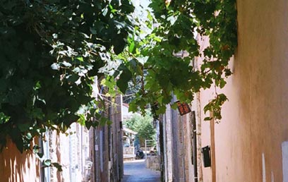 בדרום מזרח השכונה הקטנטנה ישנו מעבר צר המוליך אל שכונת-חצר חרדית נוספת - כנסת ישראל. בין שני בורות מים חתומים תמצאו שביל אספלט כהה הפונה ויורד ימינה. בהמשך מצויות שלוש מדרגות רחבות ונמוכות, שהירידה בהן מצריכה זהירות אך אינה קשה כלל. ממשיכים באותו הכיוון, לאורך הקיר החיצוני של בית המגורים הנמוך של שכונת כנסת ישראל שהיווה עם בנייתו "קיר חומה" מבוצר ללא חלונות. מקץ כ-70 מטרים מגיעים לרחוב שילה. סוכה טבעית. ביום שמש העלווה משמת מגן מקרני השמש (צילום: יאן לוי)